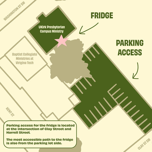 Parking access is located at the intersection of Clay St and Harrell St, where the parking lot is located. The most accessible path to the fridge & pantry is through this parking lot.